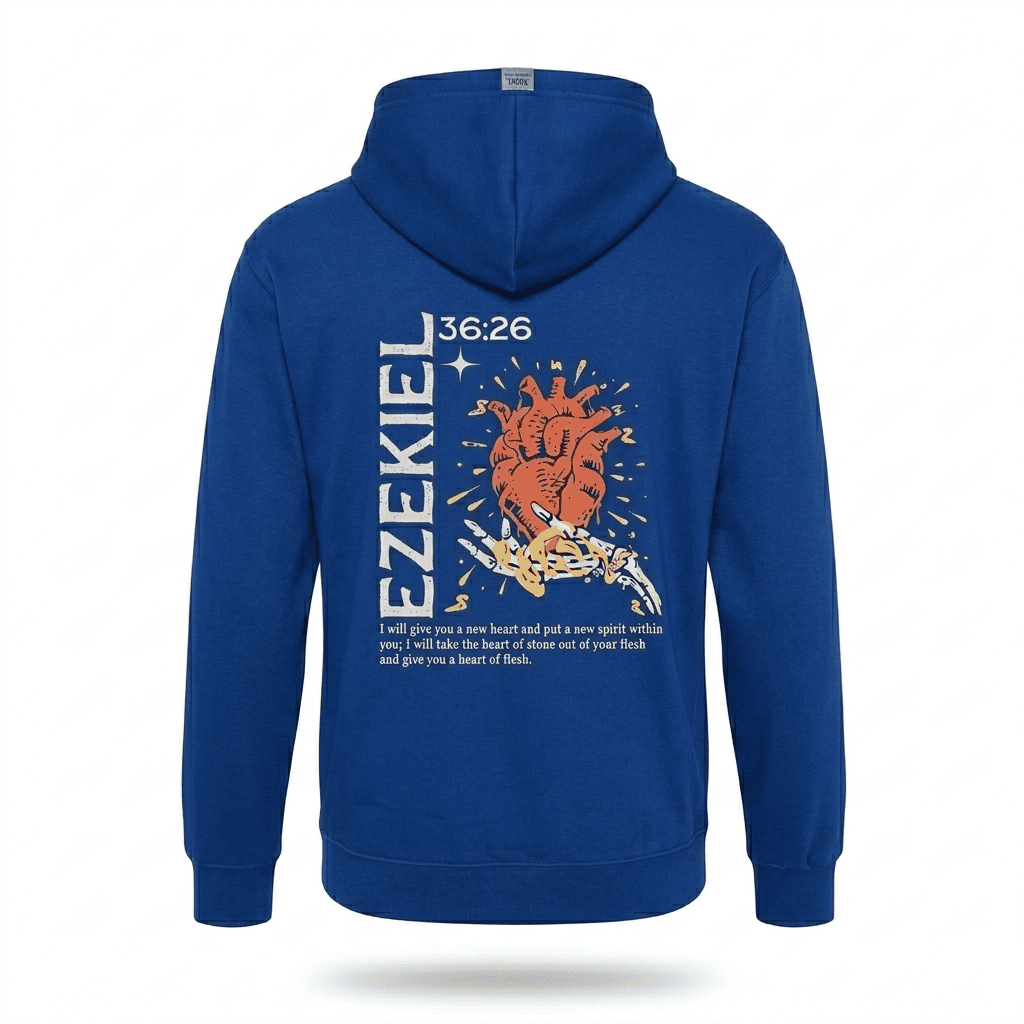 Le Message : Le design illustre littéralement la promesse de Ézéchiel 36:26. Un cœur humain vibrant est soutenu par une main, symbolisant le passage d’un « cœur de pierre » à un « cœur de chair ». Le texte intégral du verset est inscrit en anglais pour un impact universel : « I will give you a new heart and put a new spirit within you… »