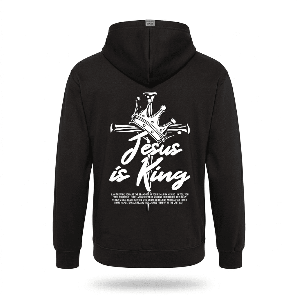 Le Message : L’affirmation centrale « Jesus is King » est magnifiée par une couronne royale déposée sur une croix formée de clous de charpentier. Ce contraste rappelle que Son royaume a été établi par Son sacrifice. Au bas du design, un texte scripturaire rappelle les paroles du Christ : « Je suis le cep, vous êtes les sarments… », soulignant notre dépendance vitale envers Lui.